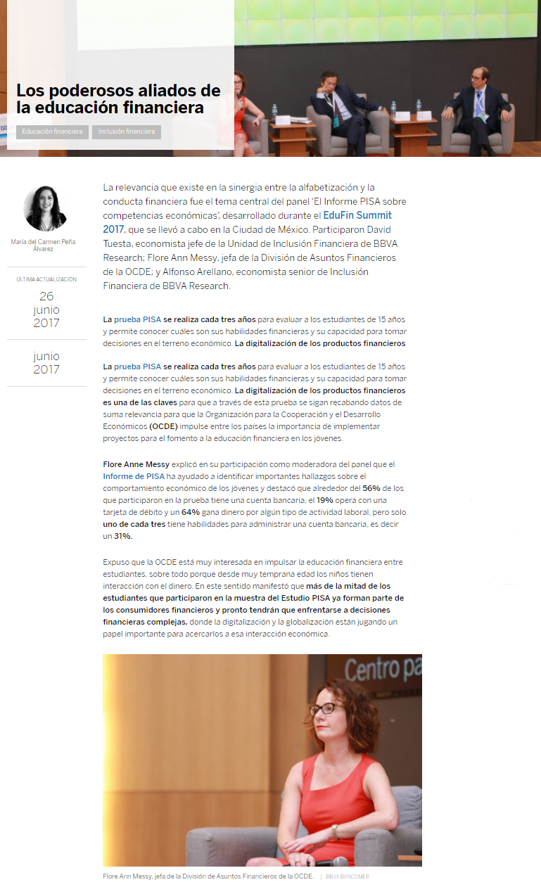 La relevancia que existe en la sinergia entre la alfabetización y la conducta financiera fue el tema central del panel ‘El Informe PISA sobre competencias económicas’, desarrollado durante el EduFin Summit 2017, que se llevó a cabo en la Ciudad de México. Participaron David Tuesta, economista jefe de la Unidad de Inclusión Financiera de BBVA Research; Flore Ann Messy, jefa de la División de Asuntos Financieros de la OCDE; y Alfonso Arellano, economista senior de Inclusión Financiera de BBVA Research.