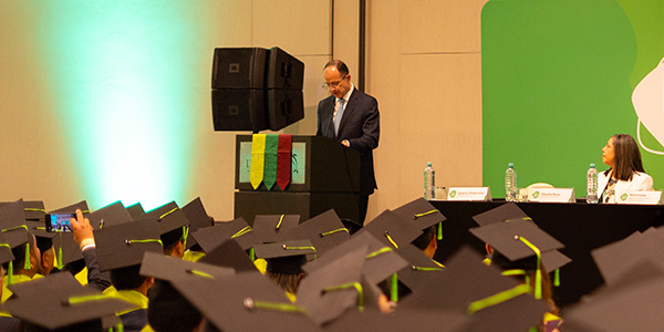 En la Ceremonia de Graduación Ecuador 2025, el Padrino de Generación, Carlos Larrea Crespo, abogado con más de 17 años
