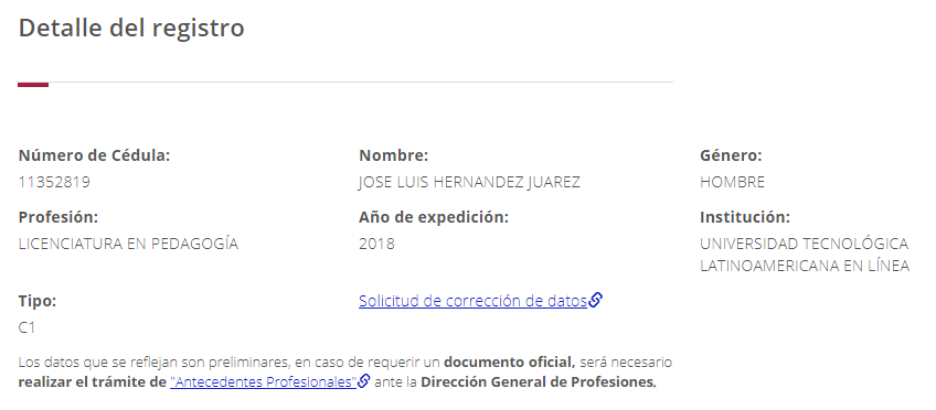 Sabemos que hace un tiempo tuviste algunas inquietudes con respecto a tu trámite de titulación, por ello nos dimos a la tarea de corroborar en el Registro Nacional de Profesionistas y la búsqueda fue exitosa.
