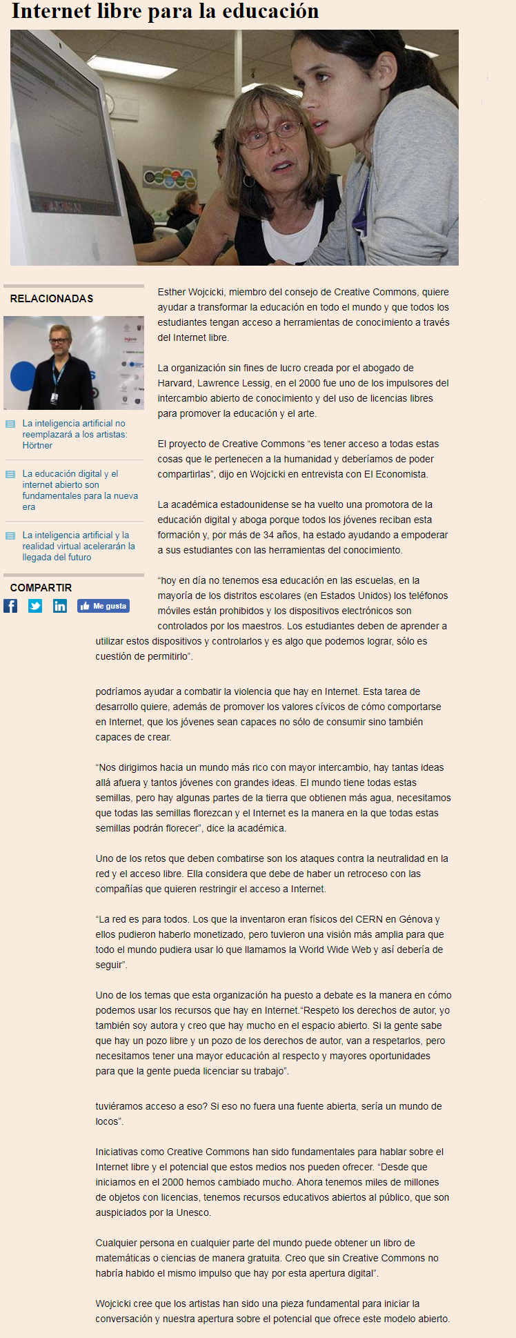 Esther Wojcicki, miembro del consejo de Creative Commons, quiere ayudar a transformar la educación en todo el mundo y que todos los estudiantes tengan acceso a herramientas de conocimiento a través del internet libre.