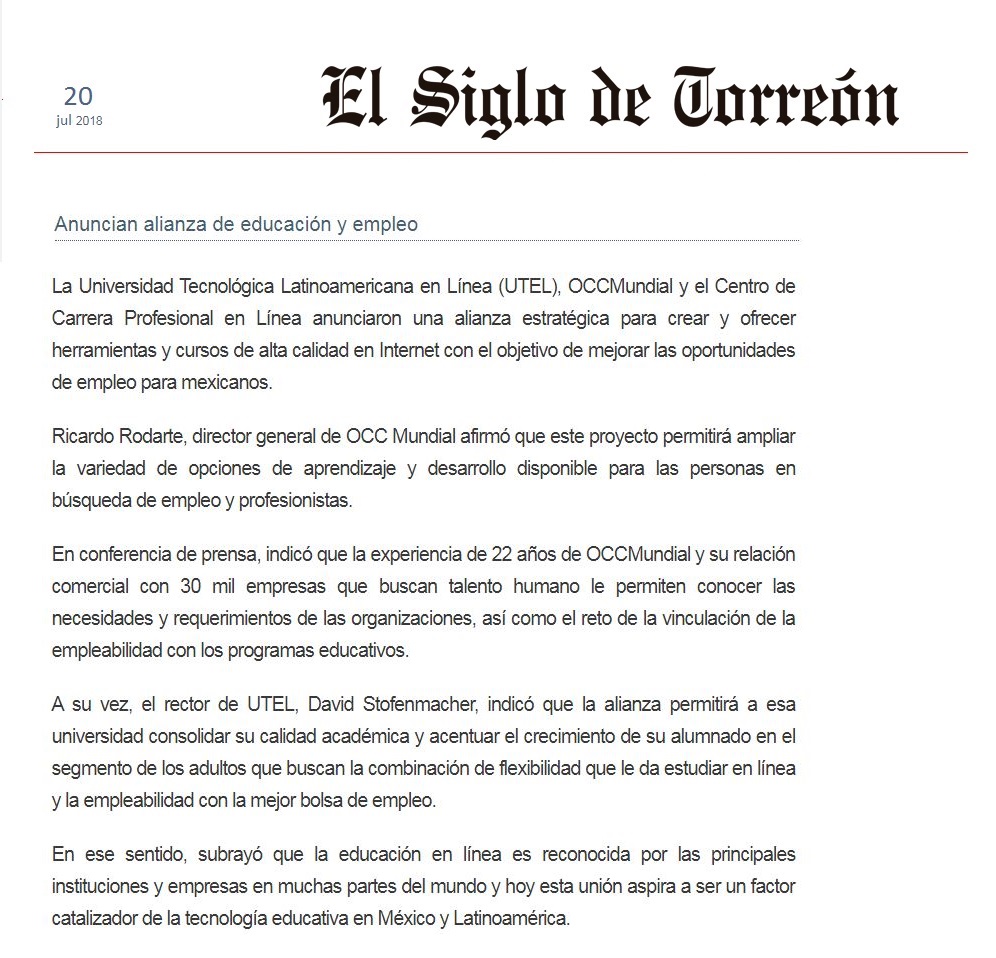 La Universidad Tecnológica Latinoamericana en Línea (UTEL), OCCMundial y el Centro de Carrera Profesional en Línea anunciaron una alianza estratégica para crear y ofrecer herramientas y cursos de alta calidad en Internet con el objetivo de mejorar las oportunidades de empleo para mexicanos.