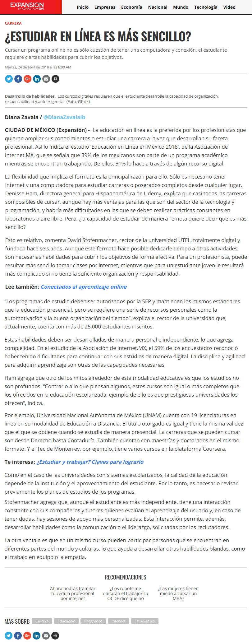 Expansión: "La educación en línea es la preferida por los profesionistas"