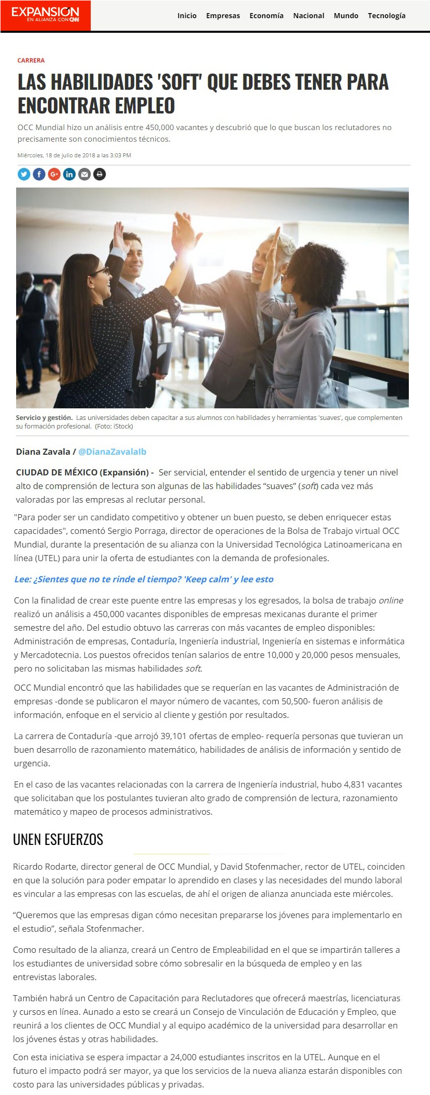 Conoce más sobre las acciones con las que UTEL y OCC pretenden facilitar la inserción laboral y el desarrollo profesional de sus alumnos en Expansión.