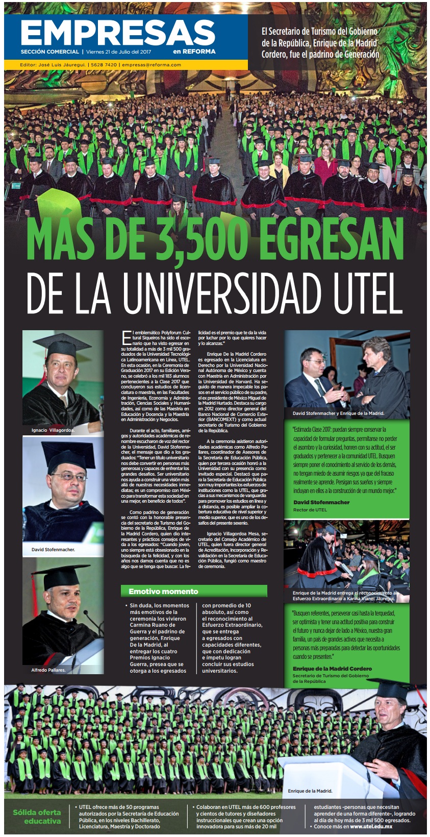 Este viernes 21 de julio, la portada de la sección “Empresas” del periódico Reforma, se vistió de verde con la más reciente Ceremonia de Graduación de UTEL, en la que nuevamente el Foro Universal fue sede de la culminación de los sueños profesionales de una generación integrada por más de mil profesionistas, que se suman a los más de 3,500 de esta universidad.