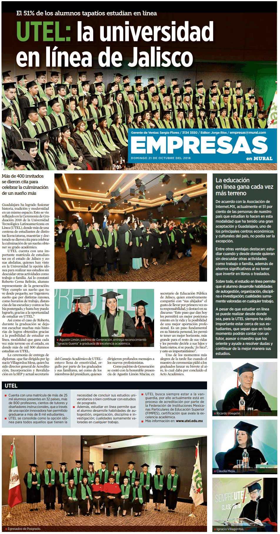 Encuentra una crónica de lo ocurrido el pasado sábado 13 de octubre, durante la Ceremonia de Graduación UTEL, así como un panorama general de la educación en línea en México, en la sección “Empresas” del periódico MURAL.