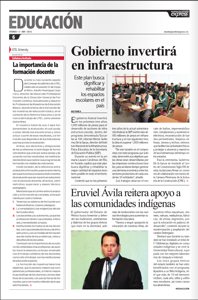 Mundo Ejecutivo Express, presentó este viernes 03 de junio, en su sección "Educación" de la edición impresa, una columna acerca de la relevancia que tiene la formación docente, retomando el discurso del Mtro. Adolfo Rodríguez Guerrero durante su participación en la más reciente sesión del Consejo Académico de UTEL.
