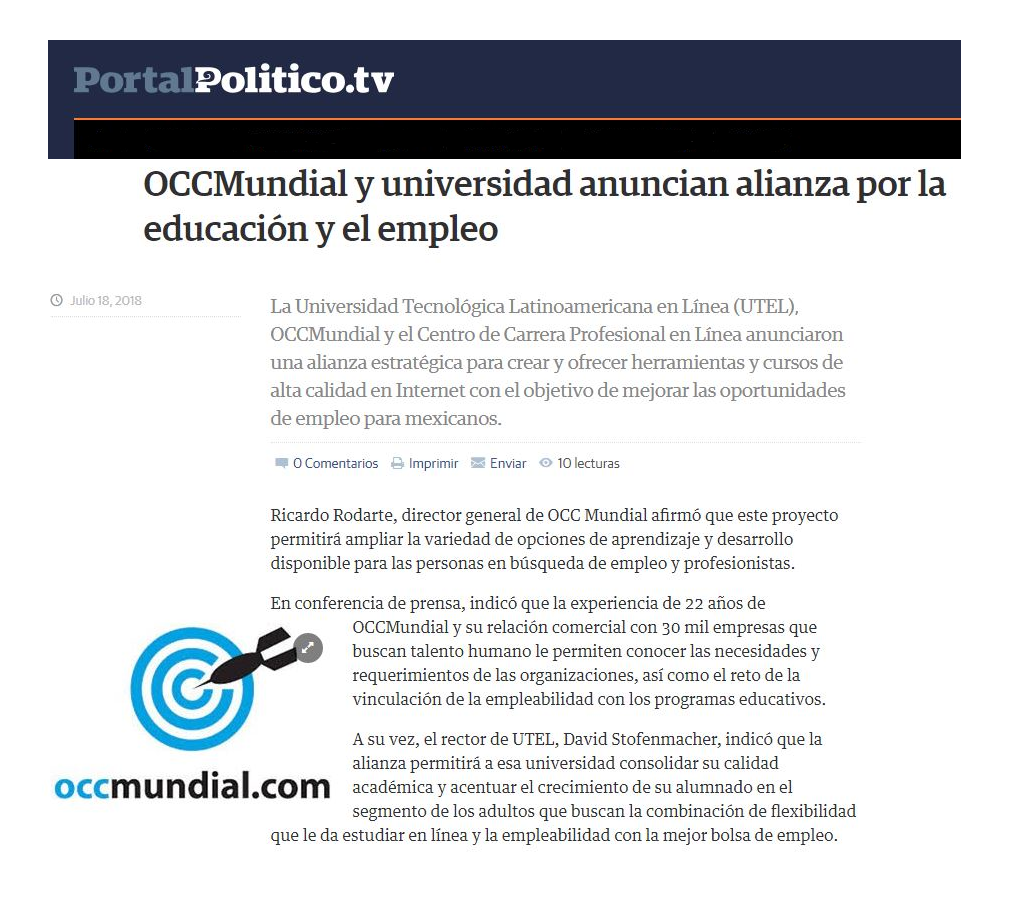 La Universidad Tecnológica Latinoamericana en Línea (UTEL), OCCMundial y el Centro de Carrera Profesional en Línea anunciaron una alianza estratégica para crear y ofrecer herramientas y cursos de alta calidad en Internet con el objetivo de mejorar las oportunidades de empleo para mexicanos.