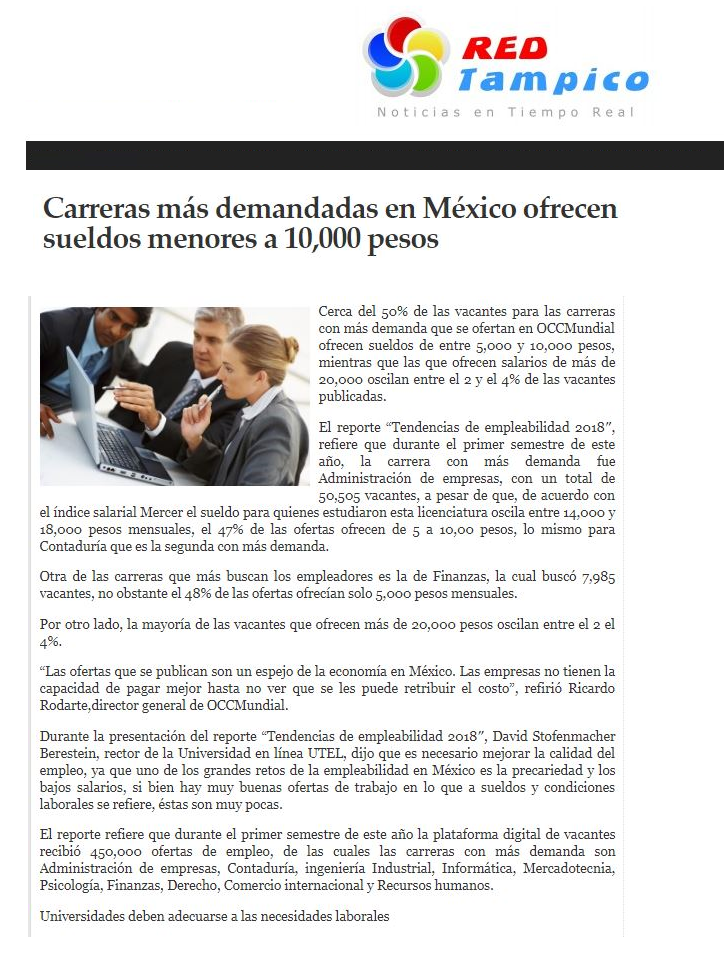 El reporte Tendencias de empleabilidad 2018, refiere que durante el primer semestre de este año, la carrera con más demanda fue Administración de empresas, con un total de 50,505 vacantes, a pesar de que, de acuerdo con el índice salarial Mercer el sueldo para quienes estudiaron esta licenciatura oscila entre 14,000 y 18,000 pesos mensuales, el 47% de las ofertas ofrecen de 5 a 10,00 pesos, lo mismo para Contaduría que es la segunda con más demanda.