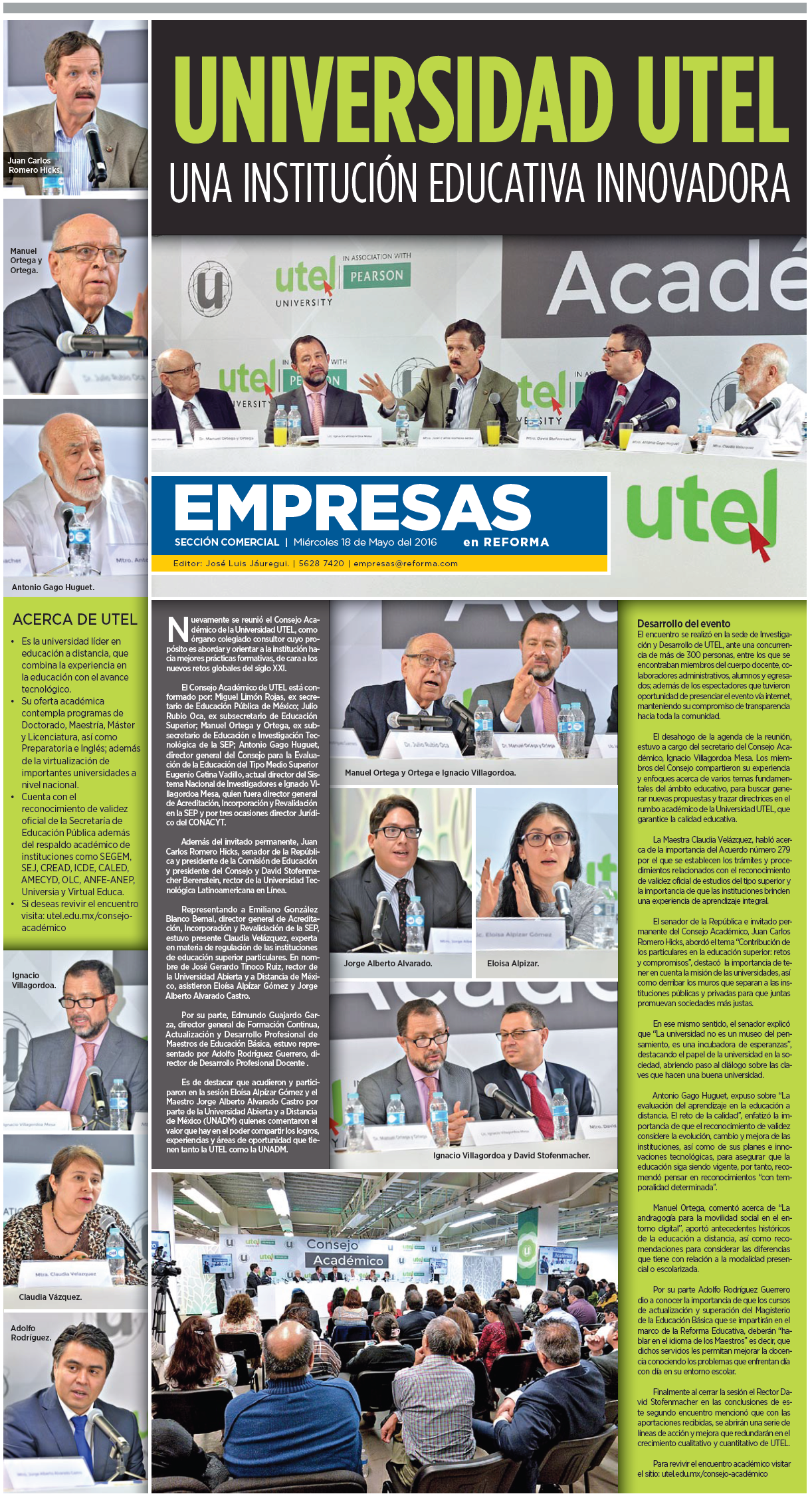 Encuentra una reseña en la sección “Empresas” del periódico Reforma, de la reciente sesión del Consejo Universitario de la Universidad UTEL ocurrido el pasado 12 de mayo, en donde los miembros compartieron su experiencia y enfoques acerca de varios temas fundamentales del ámbito educativo, buscando generar nuevas propuestas y trazar directrices en el rumbo académico de la universidad, que garanticen la calidad educativa.